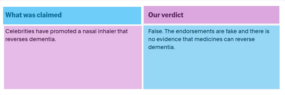 AAP FactCheck - Celebrities are not promoting a nasal inhaler that allegedly reverses dementia, despite claims online.