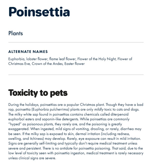 Because poinsettias are only mildly toxic, medical treatment is rarely necessary unless a pet experiences severe or persistent symptoms, the Pet Poison Helpline says.