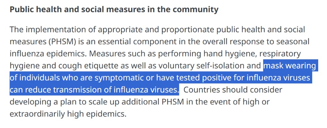 The World Health Organization says the wearing of masks by individuals who are symptomatic or have tested positive for influenza can reduce transmission of the virus, opens new tab.