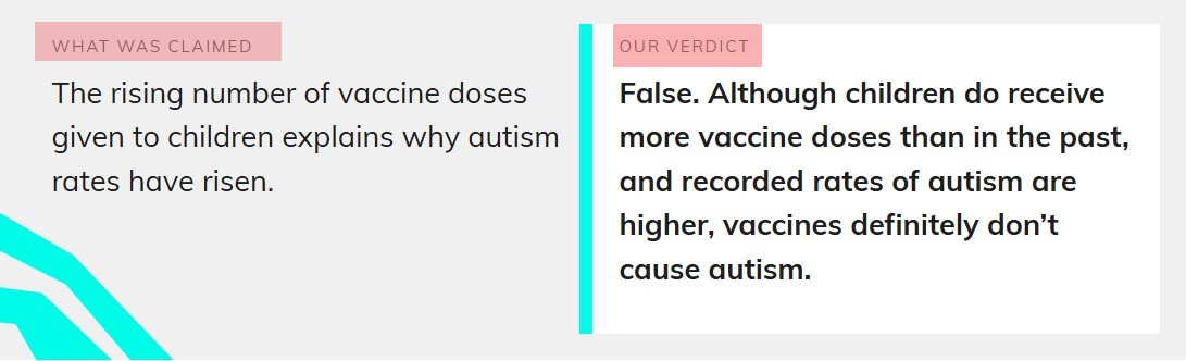 This article is part of our work fact checking potentially false pictures, videos and stories on Facebook. You can read more about this—and find out how to report Facebook content—here. For the purposes of that scheme, we’ve rated this claim as missing context because vaccines have not caused a rise in the recorded autism rate.