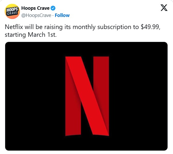One X post (archived) with more than 6 million views read: "Netflix will be raising its monthly subscription to $49.99, starting March 1st."