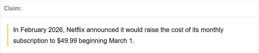Though many users reposted the claim, including Florida Gov. Ron DeSantis (archived), we found no evidence Netflix would raise its monthly price to $49.99 in March 2026.