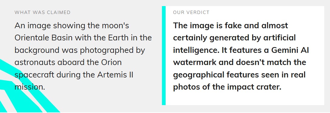 There are genuine photos from NASA showing the moon’s surface with the Earth in the background taken by Artemis II, but these don’t resemble the one we’ve checked here.
