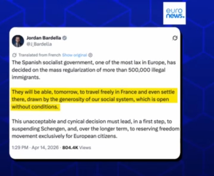 In an X post on 14 April, Jordan Bardella, leader of the French far-right National Rally party, claimed that newly documented individuals "will tomorrow be able to travel freely in France and even settle there, attracted by the generosity of our social system, which is open without conditions."