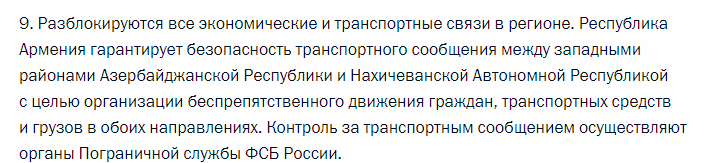 Вначале определимся с терминологией. Итак, в пункте 9 Заявлении Президента Азербайджанской Республики, Премьер-министра Республики Армения и Президента Российской Федерации от 10 ноября, опубликованном на официальном сайте Кремля, говорится следующее:
