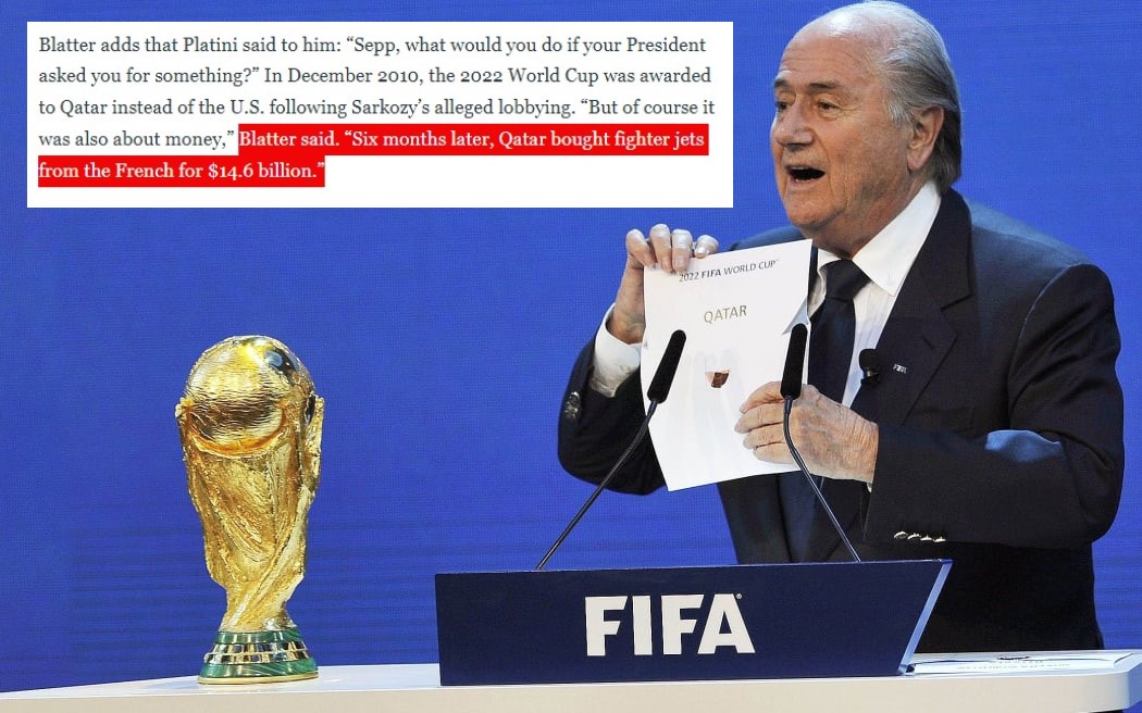 Другой и интересный аспект этого вопроса заключается в том, что бывший босс ФИФА утверждает, что победа Катара в проведении чемпионата мира, связана с оружейной сделкой на 14 миллиардов долларов. Зепп Блаттер сказал, что футбольный турнир был присужден Катару, а не Соединенным Штатам, после давления со стороны коррумпированного президента Франции Николя Саркози, который хотел заключить с Катаром крупную сделку по истребителям.