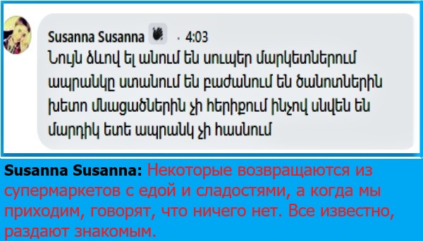 Судя по всему, сами армяне признают, что недостатка в мясе, курице, яйцах, масле, хлебе и муке в магазинах нет. Однако мошенники и спекулянты передают продукты и лекарства своим знакомым или родственникам, тем, кто может себе это позволить, а бедняки не могут, потому что товары продаются по высоким ценам.
