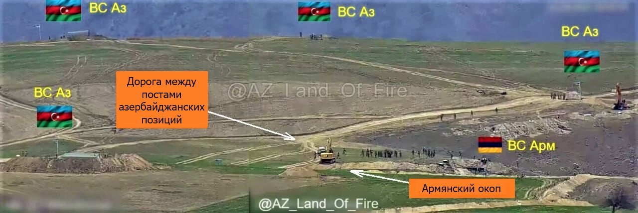 Согласно разъяснению телеграм-канала AZ_Land_Of_Fire по поводу стрельбы, на скриншотах обращают на себя внимание 4 поста, принадлежащие Вооруженным силам Азербайджана. В близком к нам кадре виден 1 армянский пост. Экскаватор на кадрах и позиция рядом с этим экскаватором принадлежат армянам.