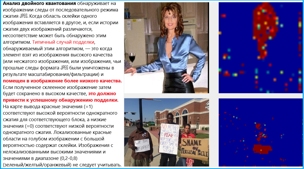 На основании данного анализа можно констатировать, что при анализе двойного квантования обнаруживает на изображении следы от последовательного режима сжатия JPEG. Когда область склейки одного изображения вставляется в другое, и, если истории сжатия двух изображений различаются, несоответствие может быть обнаружено этим алгоритмом.