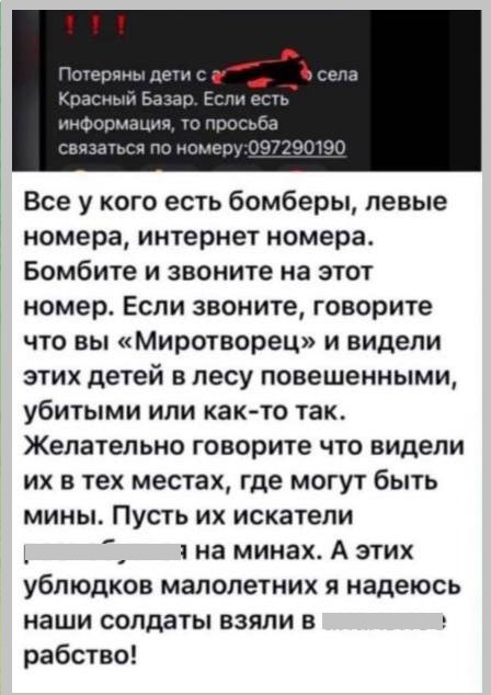 Армянские Telegram-каналы сообщили о том, что "возле Красного базара пропали дети. Если кто-то владеет информацией по этому поводу, звоните по номеру 097280190" и тем самым распространяют неверную информацию об азербайджанских солдатах. Текст, добавленный к этому сообщению от имени азербайджанских пользователей, гласит: "Если у кого-то есть левые или интернет-номера звоните по этому номеру. Если вы позвоните, скажите, что вы "миротворец" и видели, как в лесу этих вешали, убивали или что-то в этом роде. Желательно говорите, что вы видели их в тех местах, где много мин. Пусть их искатели взорвутся на минах. А этих ублюдков малолетних, я надеюсь, наши солдаты взяли в плен, в рабство".