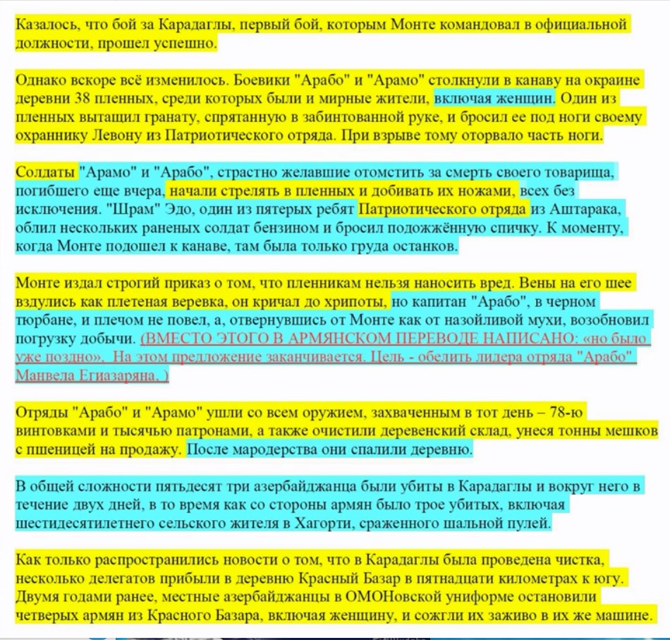 Представояем скриншоты с русского варианта книги. Выделенное желтым - то, что есть в оригинале. Выделенное синим цветом - отрывки, которые не были переведены на армянский язык.