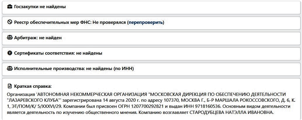 Организация «Московская дирекция по обеспечению деятельности «Лазаревского клуба»» зарегистрирована 14 августа 2020 года по адресу: 107370, г. Москва, ул. Маршала Ракосовского, д. 6, д. 1, ЭТ/ПОМ/К/ 5/XXXVI/29. Руководителем организации является Стародубцева Натэлла Ивановна, ей присвоены идентификационные номера «ОГРН 1207700292821» и «ИНН 9718160536». Основная деятельность — изучение общественного мнения.