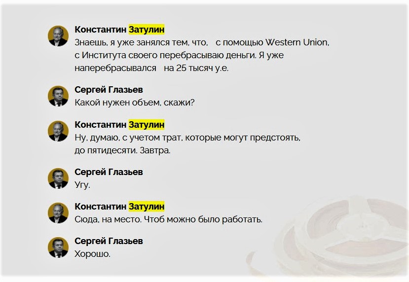 А вот и стенограмма телефонного разговора Затулина с Сергеем Глазьевым, имя которого мы упоминали ранее. В ходе беседы Затулин просит у собеседника 50 тысяч долларов США, и получает согласие. Впоследствии и Глазьев, и Затулин заявили, что аудиозапись является фальшивкой, однако не смогли привести ни одного убедительного аргумента в её опровержение.