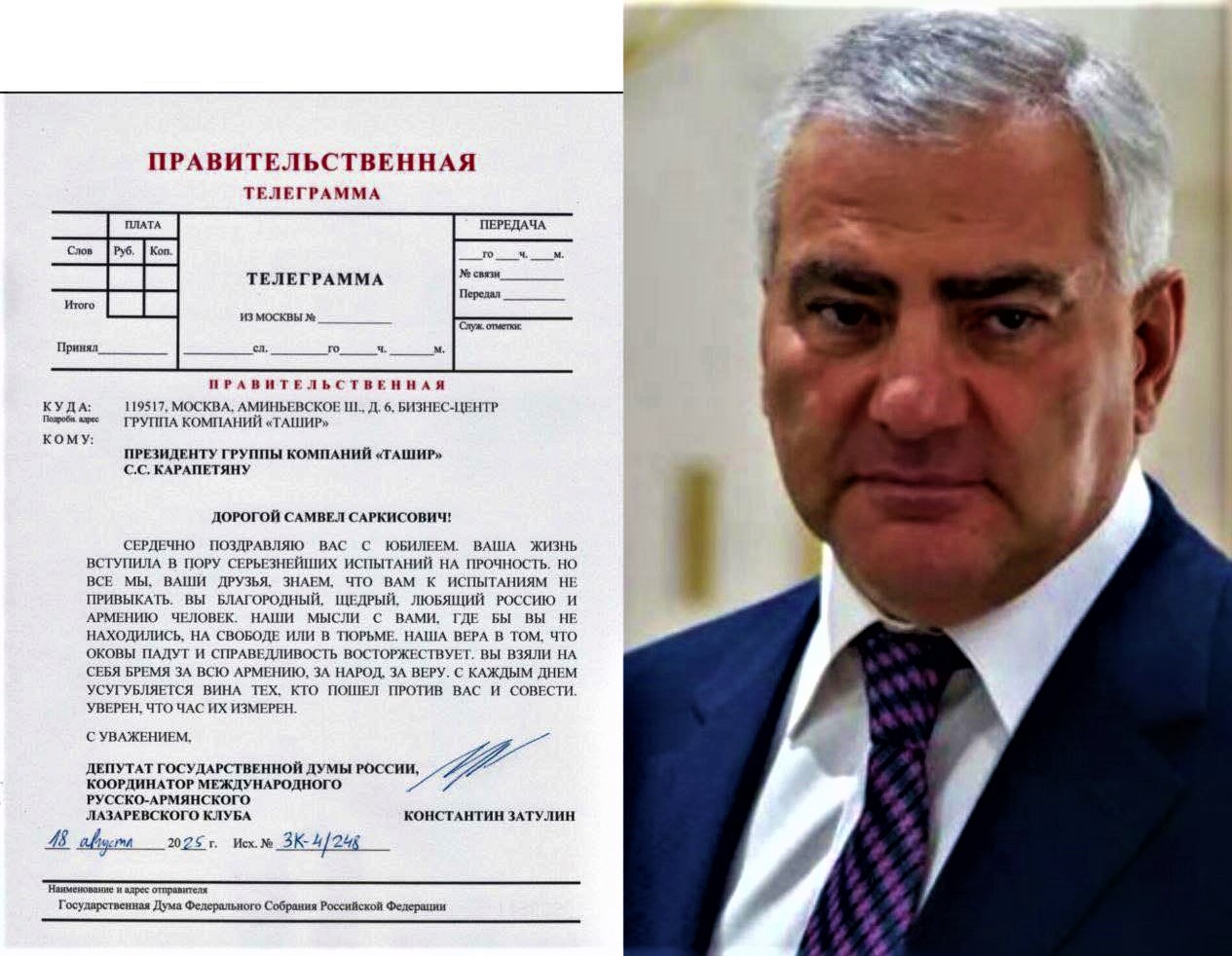 Приводя этот пример, стоит отметить, что ни поездки в Ереван, организованные для Затулина, ни дорогие подарки, ни многомиллионные гонорары так и не нашли отражения в его декларации о доходах. Подобно Аванесову, он был напрямую вовлечён в присвоение крупных денежных средств. Более того, Затулин не забыл поздравить с 60-летием своего основного спонсора и близкого друга — Самвела Карапетяна, который в настоящее время находится под арестом в Армении. Поздравление он направил в форме официальной государственной телеграммы.