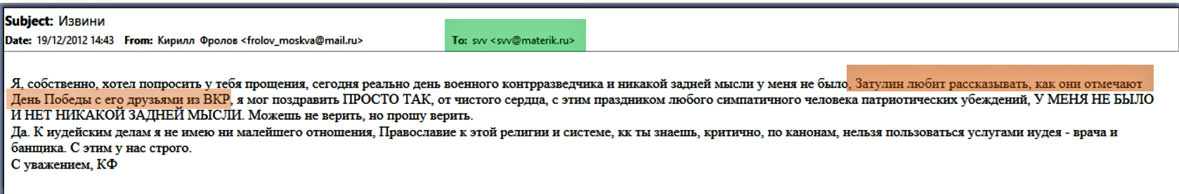 В 2016 году хакерам удалось взломать электронную почту Фролова. В то время среди переписки было выявлено, что он поддерживал регулярную связь с неким лицом с инициалами «SVV», чья электронная почта была зарегистрирована на домене «Института стран СНГ».