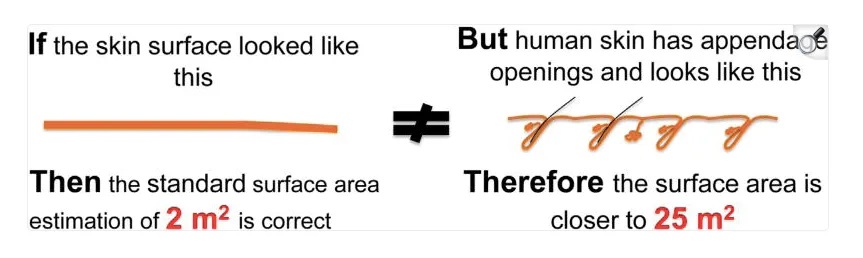 Однако эти вычисления будут верны только в том случае, если считать кожу просто ровной поверхностью. На эту неточность в 2018 году обратил внимание дерматолог Ричард Галло из Калифорнийского университета в Сан-Диего. Если брать в расчёт волосяные фолликулы, потовые и сальные железы, то реальная площадь кожи составит почти 25 кв. м.