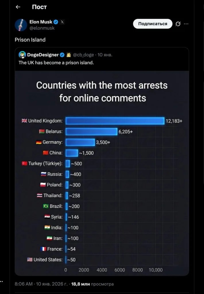 10 января владелец соцсети X, бизнесмен Илон Маск ретвитнул два поста с одной и той же инфографикой, на которой 14 стран ранжированы по числу арестов за комментарии в интернете. В этом рейтинге с большим отрывом лидировала Великобритания. Первый ретвит Маск сопроводил комментарием «Тюремный остров», а второй — «Почему правительство Соединённого Королевства такое фашистское?» На момент написания этого разбора твиты набрали 18 млн и 13 млн просмотров соответственно.