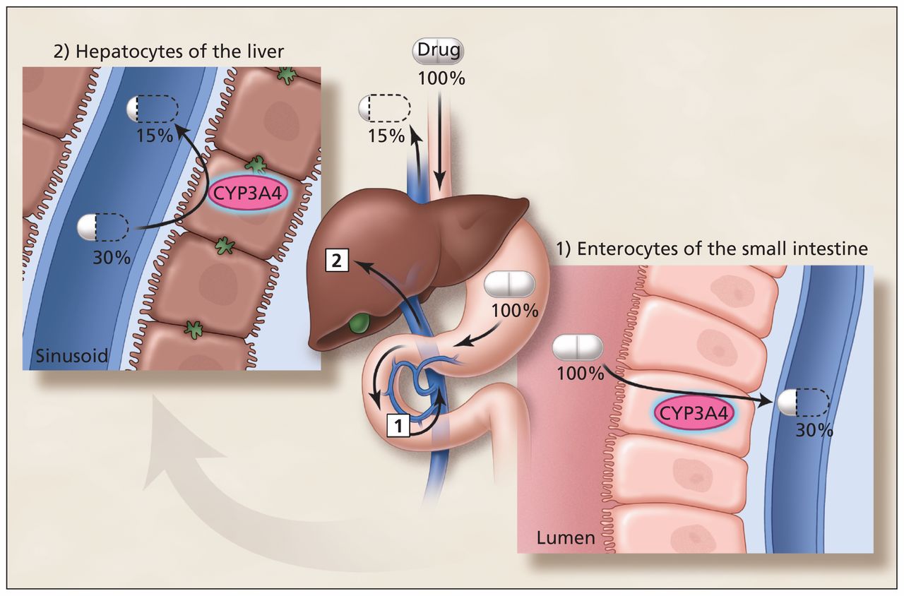 Грейпфрут содержит вещества, называемые фуранокумаринами. Они подавляют активность фермента печени CYP3A4, который участвует в метаболизме многих лекарственных средств. При снижении активности этого фермента лекарства могут расщепляться медленнее, что приводит к повышению их концентрации в крови.