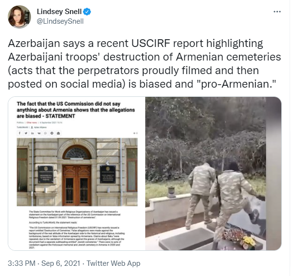 Daha sonra gazeteci Lindsey Snell, Twitter mikroblogunda birkaç fotoğraf paylaştı ve Azerbaycan'ın USCIRF'in Azerbaycan askerleri tarafından Ermeni mezarlarının tahrip edilmesine ilişkin son raporunu "önyargılı" ve "Ermeni yanlısı" olarak nitelendirdiğini tweetledi.
