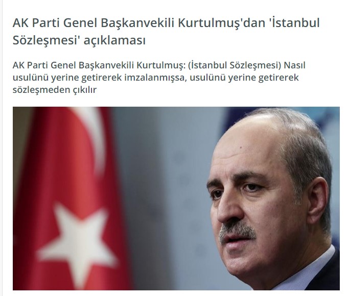 Anadolu Yayıncılar Derneği tarafından gerçekleştirilen ‘Anadolu Soruyor’ programına konuk olan AK Parti Genel Başkanvekili Numan Kurtulmuş, gündeme dair açıklamalarda bulundu. Kurtulmuş, İstanbul Sözleşmesi’nin imzalanmasını doğru bulmadığını belirterek, usulüne uygun sözleşmeden çıkılabileceğinin sinyallerini verdi. Kurtulmuş, “İstanbul Sözleşmesi’nin üzerinde çalışmış biri olarak, sözleşmenin imzalanmasını doğru bulmuyorum. Bu metnin içerisinde iki tane önemli husus var. Dikkat çekmemiz gereken ve bizimle asla uyuşmayan. Bunlardan birisi toplumsal cinsiyet meselesi ve cinsel yönelim tercihi. Sözleşmenin içerisinde yer alan ’sözde namus, ahlak gibi konularla mücadele etmek hükümetlerin meselesidir’ diye bir kavram geçiyor. Bunlar asla kabul edilebilir konular değildir. Birtakım aile değerlerindeki zedelenmelerin ortaya çıkması tek başına İstanbul Sözleşmesi’nden kaynaklanan bir durum değildir. İstanbul Sözleşmesi yanlış bir şeydir. İstanbul Sözleşmesi olmazsa kadına karşı şiddet artar tezi de yanlıştır.’’ – dedi.( Kaynak)