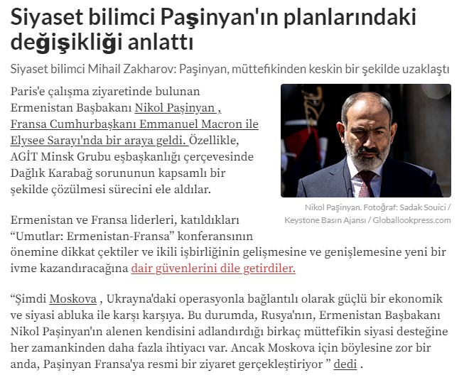 "Paşinyan'ın şu anki Paris ziyareti henüz bir ihanet değil, ama bunun için şimdiden bir hazırlık. Rusya lideri ve siyasileri, Paşinyan'ın esasen Rusya'nın düşmanı olduğunun çok iyi farkında. Nüfusun çoğunluğunun görüşleri göz önüne alındığında, Ermenistan'ın jeopolitik önemi nedeniyle, Paşinyan Rusya ile dostane ilişkiler kurmak zorunda kalıyor, ancak bunu yapmak zorunda olduğu için yapıyor ama aynı zamanda Batı'ya da göz kırpıyor, oraya nasıl gideceğini düşünüyor, Ermeni toplumunu da yanına almak istiyor."( Kaynak)