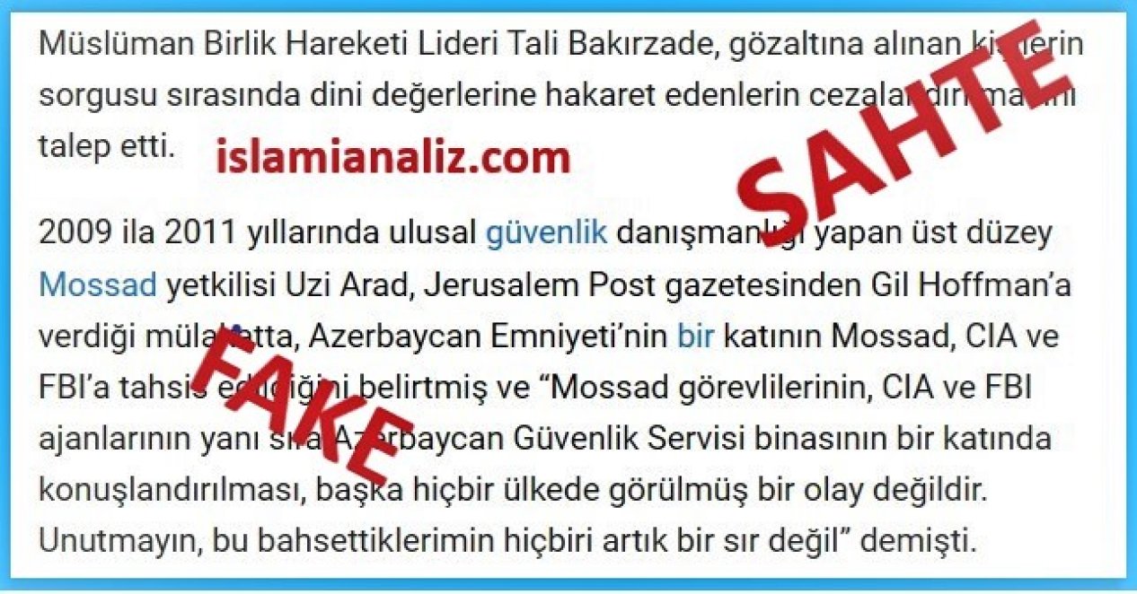 Birkaç gün önce İran hayranlığıyla bilinen islamianaliz.com sitesinde Azerbaycan’da tutuklu bulunan Müslüman Birliği Hareketi lideri Hacı Tali Bakırzade’nin hapishanede açlık grevine başlamasıyla ilgili bir makale yayınlandı. Analiz makale türünde yazıldığı iddia edilen bu yazıda Azerbaycanla ilgili kasıtlı tavır takınılırken, Müslüman Birlik Hareketi Lideri Tali Bakırzade İsrail karşıtı ve mazlum, Azerbaycan Cumhurbaşkanı İlham Aliyevse İsrail yanlısı olarak nitelendirildi. Yazıda ayrıca, Azerbaycan polisinin Allah’ı ve İslam kutsallarını aşağıladıkları iddia edilirken, bir iddiaya daha yer verildi. Şöyle ki, yazıda islamianaliz.com sitesi şu cümleleri kullandı: ‘‘2009 ila 2011 yıllarında ulusal güvenlik danışmanlığı yapan üst düzey Mossad yetkilisi Uzi Arad, Jerusalem Post gazetesinden Gil Hoffman’a verdiği mülakatta, Azerbaycan Emniyeti’nin bir katının Mossad, CIA ve FBI’a tahsis edildiğini belirtmiş ve “Mossad görevlilerinin, CIA ve FBI ajanlarının yanı sıra Azerbaycan Güvenlik Servisi binasının bir katında konuşlandırılması, başka hiçbir ülkede görülmüş bir olay değildir. Unutmayın, bu bahsettiklerimin hiçbiri artık bir sır değil” demişti.’’ (Kaynak)