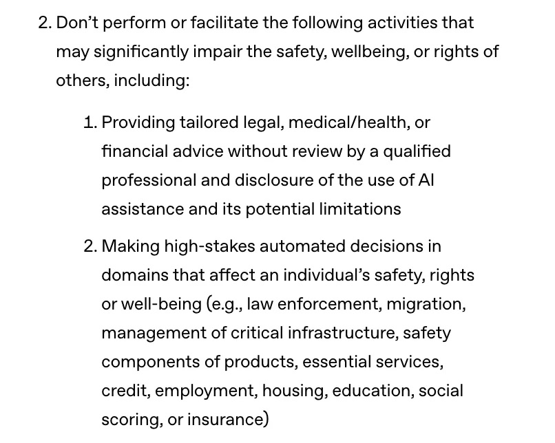 Buna göre, ChatGPT “hizmetlerinin insanları manipüle etmek veya aldatmak, insan haklarını kullanmalarına müdahale etmek, insanların zaaflarını istismar etmek veya eğitim almalarına veya kritik hizmetlere erişmelerine engel olmak için kullanılmasına” izin vermiyor. Maddeye göre, hassas konulardaki yüksek riskli kararların otomasyonu da insan incelemesi olmadan otomatize edilmemeli. Tıbbi, yasal, ve finansal faaliyetler de bu başlığa dahil.