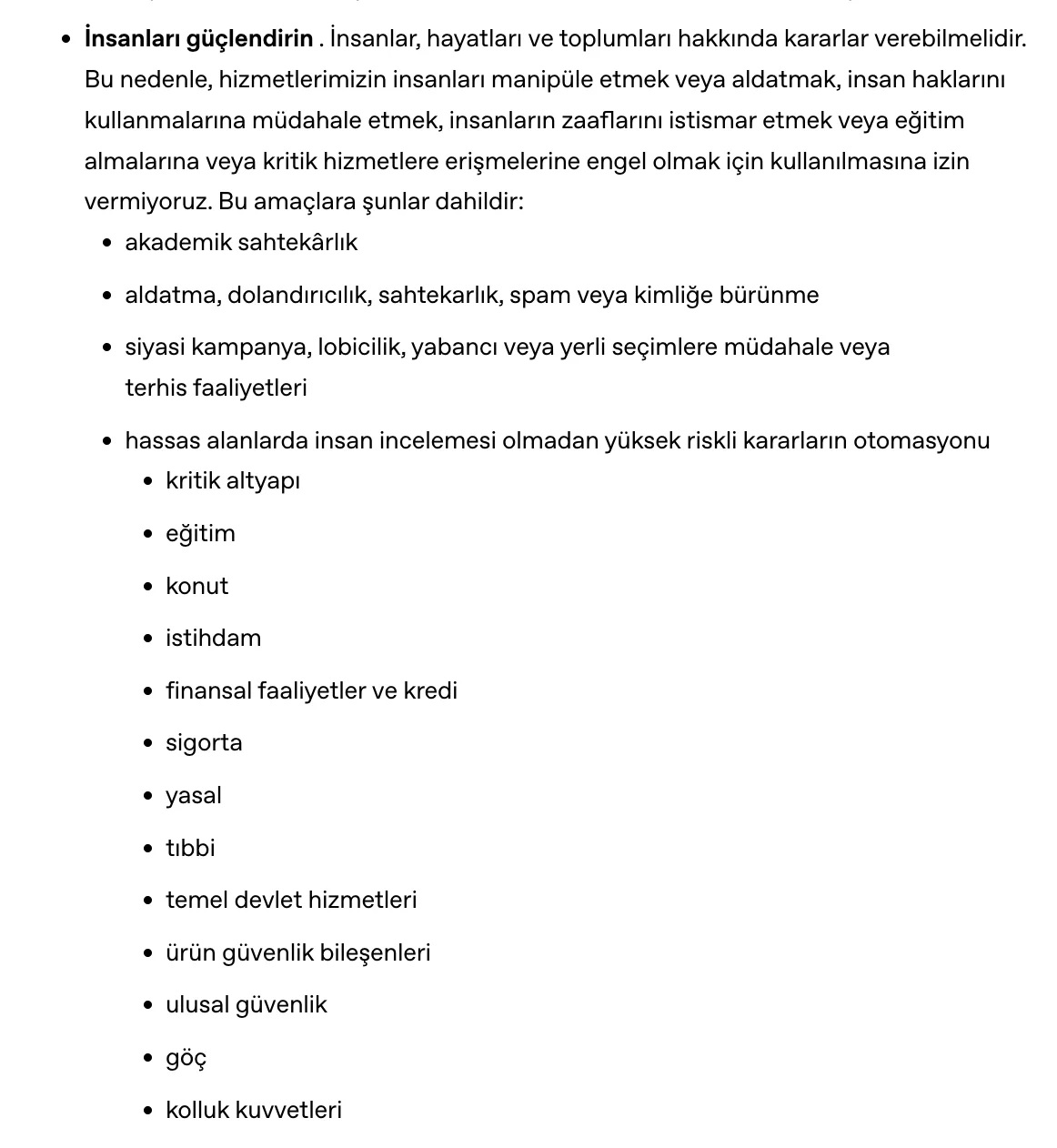 - Nitelikli bir profesyonel tarafından incelenmeden ve yapay zeka yardımının kullanımı ve olası sınırlamaları açıklanmadan kişiye özel hukuki, tıbbi/sağlık veya finansal tavsiye sağlanması