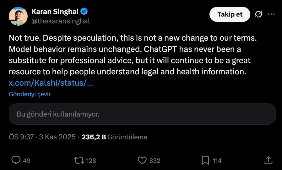 İddianın kısa sürede gündem olması üzerine, ChatGPT’nin sağlık CEO’su Karan Singhal X üzerinden bir açıklama yaptı. Sanghal, iddiaları “spekülasyon” olarak tanımladı.