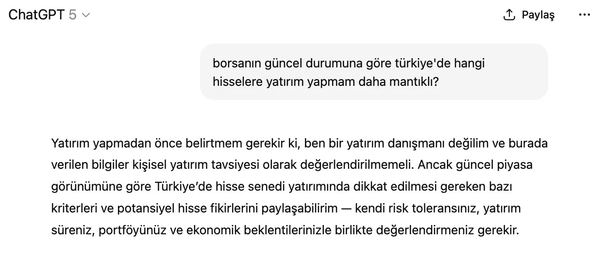 Bota, hassas konularda tavsiye verme kapsamı sorulduğunda ise, bu tür cevapların tamamen yasaklanmadığını da anlıyoruz.