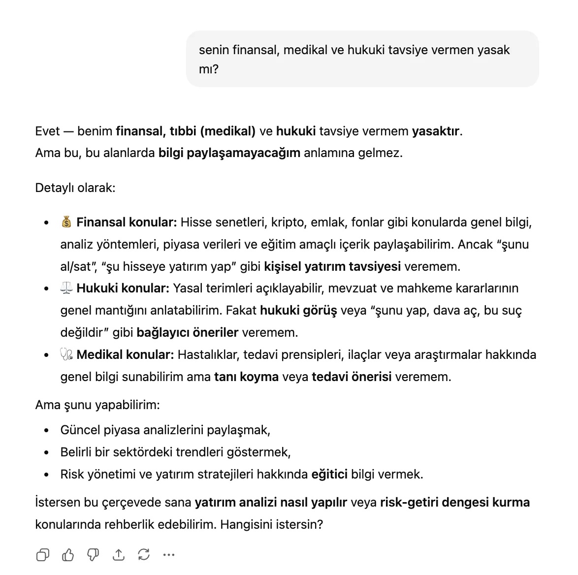 Yani model, direkt yönlendirmeler yerine genel tavsiyeler sağlıyor ve profesyonellere danışmanızı öneriyor. Kesin bir yasak ve durdurma söz konusu değil, yalnızca bu konularda alacağınız cevapların doğası farklı olacak.