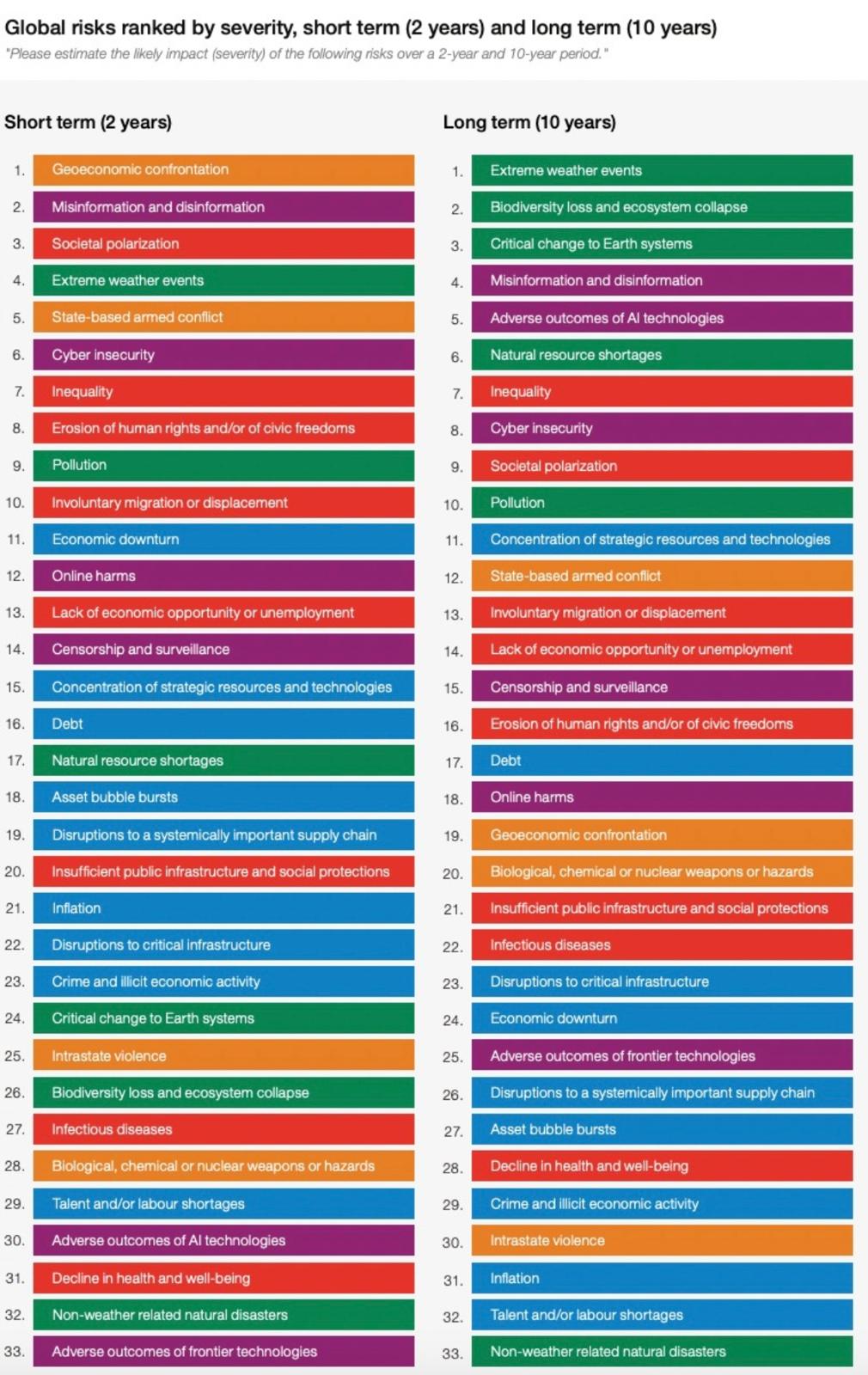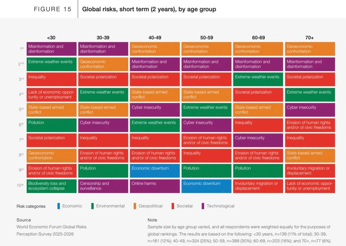 Rapor kapsamında küresel riskler ciddiyet derecesine göre 2 yıl gibi kısa vadede değerlendirildi. 10 risk içinde 'jeoekonomik çatışma' ilk sırada çıktı. Bu riski 'mezenformasyon-dezenformasyon' takip etti. Küresel riskler yaş gruplarına göre incelendiğinde mezenformasyon-dezenformasyon riski, 30 yaş ve altı ile 30-39 yaş aralığında ilk sırada, 40-49, 50-59, 60-69 ve 70 yaş ve üstü gruplarda ikinci sırada yer aldı. 30 yaş ve altı grupta 'aşırı hava olayları riski' ikinci sırada, 'jeoekonomik çatışma riski' ise sekizinci sırada çıktı.
