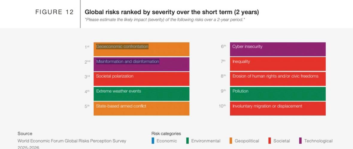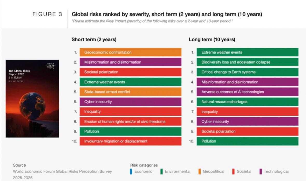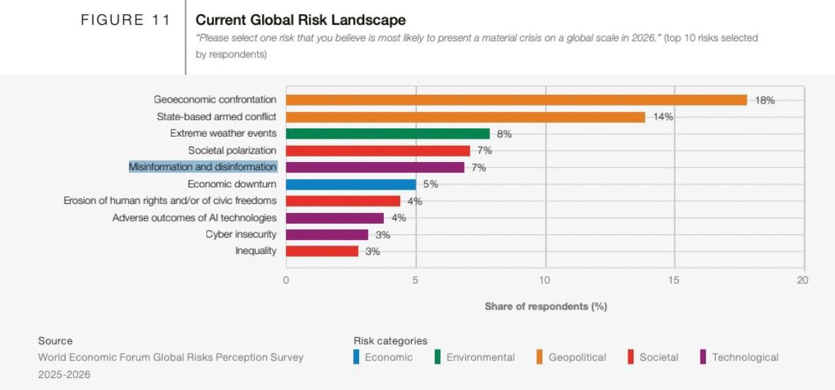 Dünya Ekonomik Forumu (WEF) İsviçre'nin Davos kasabasında düzenlenecek toplantı öncesi "2026 Küresel Riskler Raporu" yayımladı. Gelecek 2 ve 10 yılı değerlendiren raporda küresel ekonomi için en ciddi/büyük riskler sıralandı: 2026-2028 aralığında jeoekonomik çatışma, 2026-2036 aralığında ise aşırı hava olayları birinci sırada çıktı. Dezenformasyon ve mezenformasyon ise teknolojik ve toplumsal risk kategorisinde ele alındı. Bu sorun, gelecek 2 yılda ikinci sırada, gelecek 10 yılda dördüncü sırada görüldü.