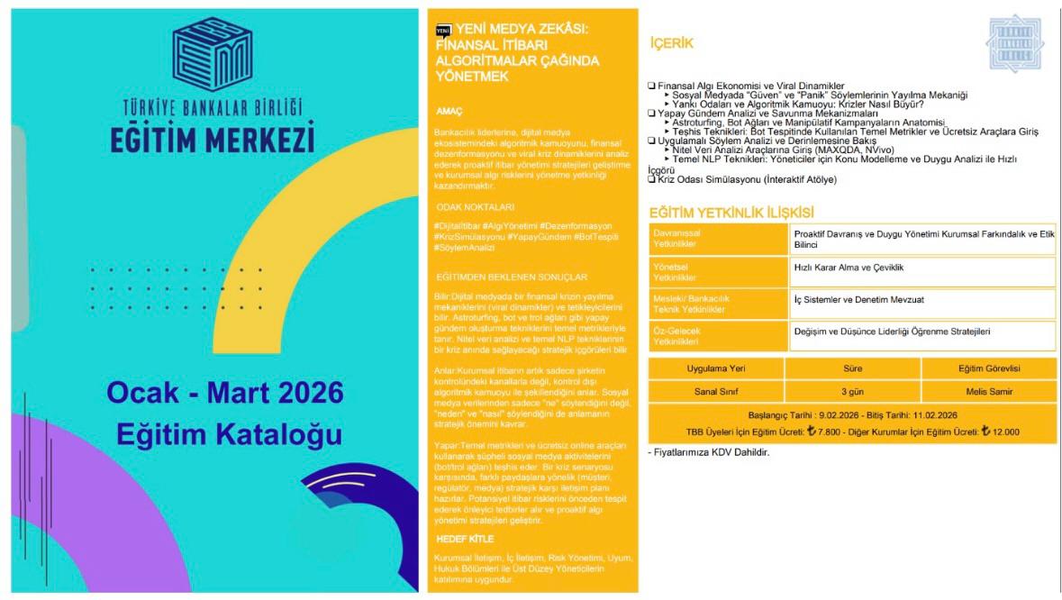 TBB Eğitim Merkezi'nin Ocak-Mart 2026 Eğitim Dönemi program kataloğuna göre "Yeni medya zekası: Finansal itibarı algoritmalar çağında yönetmek" başlıklı programda dezenformasyon konu ediliyor. Eğitim programıyla "Bankacılık liderlerine, dijital medya ekosistemindeki algoritmik kamuoyunu, finansal dezenformasyonu ve viral kriz dinamiklerini analiz ederek proaktif itibar yönetimi stratejileri geliştirme ve kurumsal algı risklerini yönetme yetkinliği kazandırmak" amaçlanıyor. Eğitim kapsamında "Sosyal Medyada 'Güven' ve 'Panik' Söylemlerinin Yayılma Mekaniği", "Astroturfing, Bot Ağları ve Manipülatif Kampanyaların Anatomisi", "Yankı Odaları ve Algoritmik Kamuoyu: Krizler Nasıl Büyür?" ve "Yapay Gündem Analizi ve Savunma Mekanizmaları" gibi başlıklar tartışılacak.