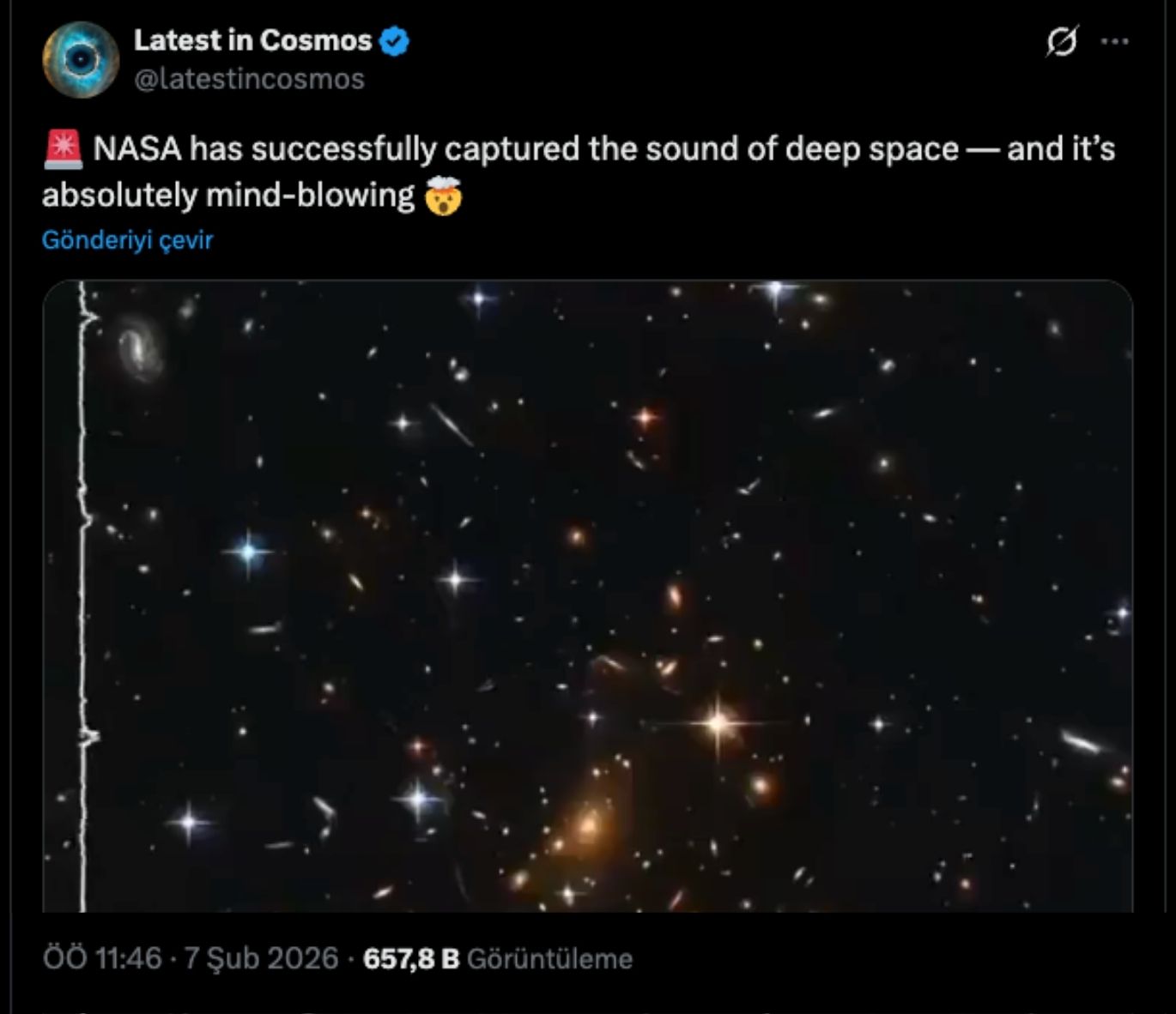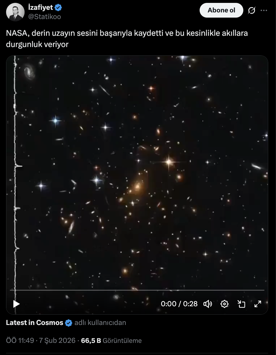 ABD merkezli sosyal medya platformu X'te "NASA, derin uzayın sesini başarıyla kaydetti ve bu kesinlikle akıllara durgunluk veriyor" mesajıyla yapılan paylaşım kısa sürede gündem oldu.