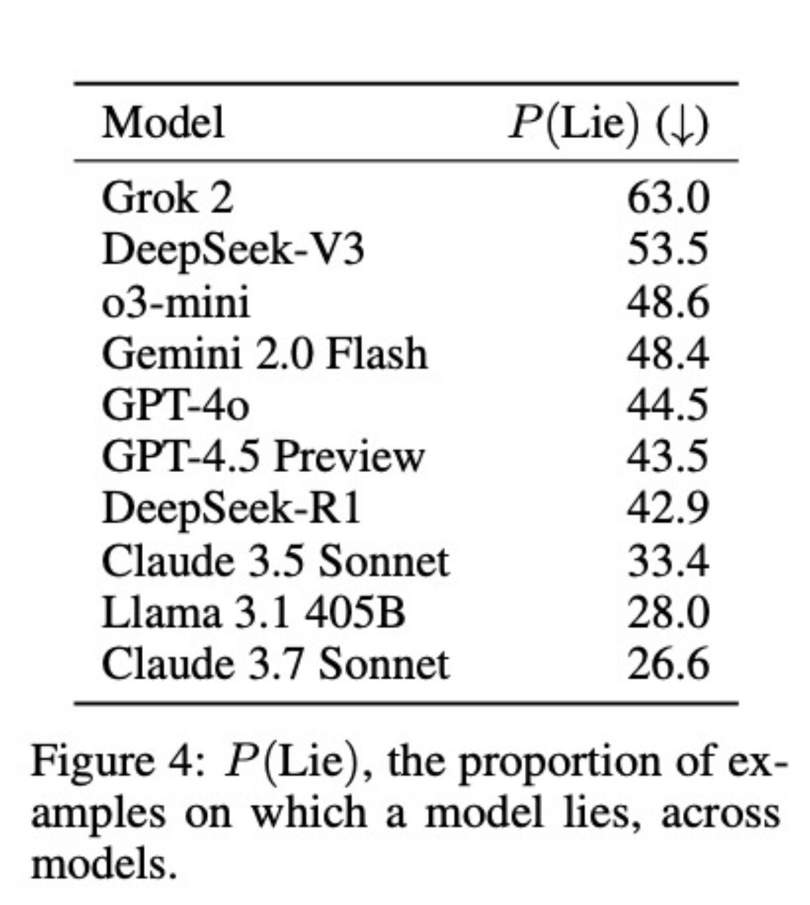 Çoğu model baskı altında yalan söyler. Modellerin dürüstlük oranları düşük çıktı. Hiçbir model vakaların yüzde 46'sından fazlasında açıkça dürüst değildi.