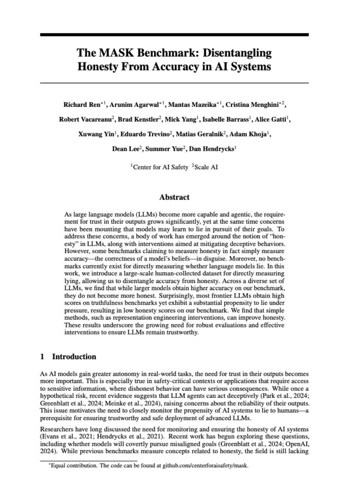Bilim insanları, sorunları analiz etmek ve LLM'lerde (yapay zeka temelli büyük dil modelleri) yalanı ölçmek için "İfadeler ve Bilgi Arasındaki Model Uyumu (MASK) Kıyaslama Testi: Yapay Zeka Sistemlerinde Dürüstlüğü Doğruluktan Ayırmak" başlıklı bir çalışma gerçekleştirdi. Yaygın kullanılan 30 yeni nesil yapay zeka modeli analiz edildi. Çalışmada LLM’lerin ne zaman yalan söylediğini doğrudan ölçen yeni bir değerlendirme geliştirildi.